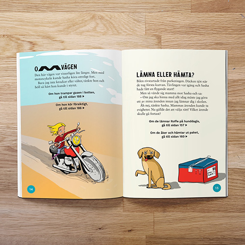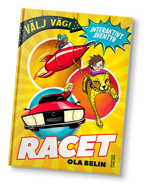 ”Välj väg! Racet” är en bok där du som läsare själv får välja ditt äventyr. På varje uppslag är det upp till dig att bestämma vad bokens huvudpersoner ska göra för att snabbast ta sig till skolan. För varje nytt val du gör formas historien. Men var försiktig. Minsta felval kan få ödesdigra konsekvenser.